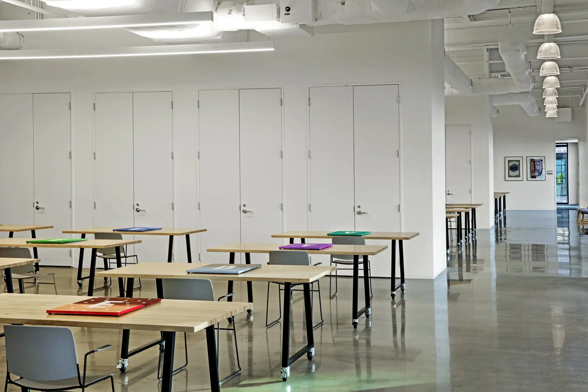 Flexibility was a central design criteria for this building, as programs change over time. The floor plan is largely open, with furniture that can be reconfigured in time to support varied training and employment formats. The clear height for each floor was increased to both support this flexibility and to maximize natural daylight throughout the building.